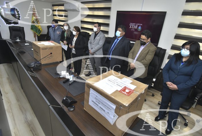 El Presidente del Tribunal Departamental de Justicia de La Paz, Dr. Jorge Quino Espejo y el presidente del Tribunal Supremo de Justicia, Dr. Olvis Egüez Oliva, acto de entrega de pruebas antígeno nasal para jueces de los distintos tribunales departamentales de justicia a nivel Nacional.