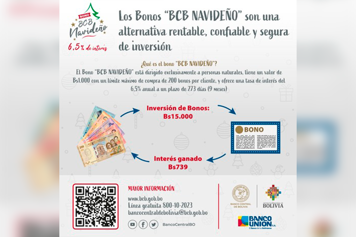 “El ‘Bono BCB Navideño’ está dirigido exclusivamente a personas naturales, tiene un valor de Bs 1.000 con un límite máximo de compra de 200 bonos por cliente y ofrece una tasa de interés del 6,5% anual a un plazo de 273 días (9 meses)”, indicó el ente emisor mediante su página digital.