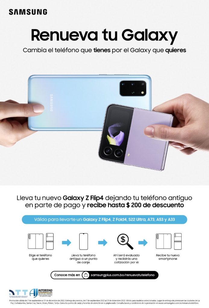 Los usuarios pueden intercambiar sus dispositivos móviles a medio uso por un Galaxy Z Flip4, Galaxy Z Fold4, Galaxy S22 Ultra, Galaxy A73 5G, Galaxy A53 5G y el Galaxy A33 5G. Los bolivianos podrán hacer el canje en tiendas de experiencias, Kioskos Samsung, Next Level, Dismac y comercios autorizados de La Paz, El Alto, Cochabamba, Santa Cruz, Tarija, Oruro y Potosí.