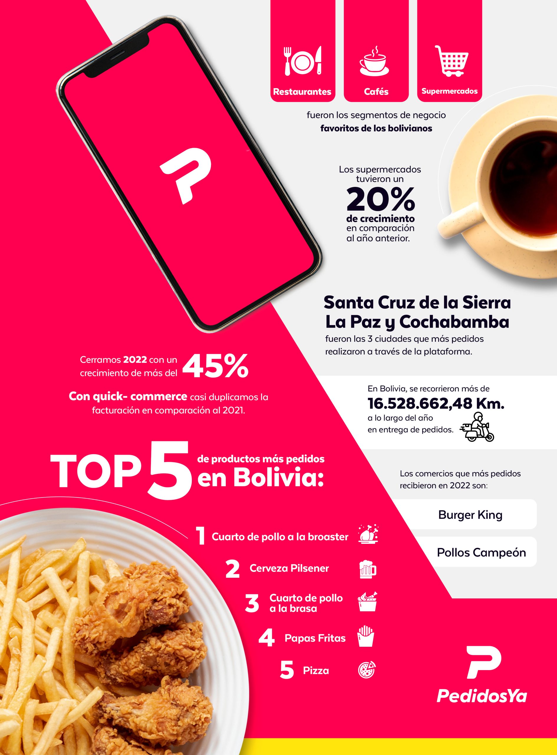 Bolivia, diciembre de 2022.- PedidosYa, la empresa de tecnología líder en quick- commerce de Latinoamérica, presentó su informe de tendencias de fin de año que destaca, entre otros datos, cuáles fueron los segmentos de negocio de mayor crecimiento, los productos más pedidos, los horarios y días de mayor demanda, las distancias máximas y mínimas recorridas, etc; este año. «Cerramos 2022 con un crecimiento de más del 45% y con quick- commerce casi duplicando su facturación vs 2021. Esta tendencia de hacer compras de necesidad inmediata para recibirlas en minutos se consolidó muy fuertemente en 2022 y sin dudas seguirá creciendo los próximos años. El quick-commerce, que es la evolución del e-commerce, llegó para quedarse y apuntamos a que en 2030 un tercio de los pedidos que recibamos en Latinoamérica sean de quick- commerce,” comentó Esteban Gutiérrez, CEO de PedidosYa.