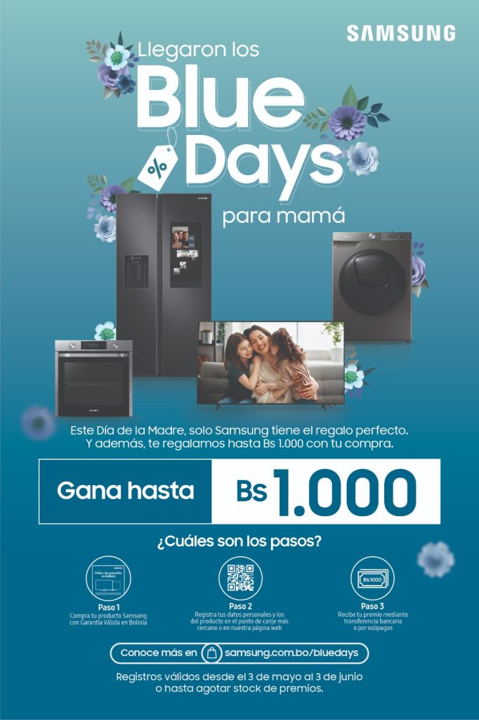 “Los interesados deben asegurarse que el producto cuente con el sello de Garantía Oficial en Bolivia, registrar sus datos personales y del electrodoméstico en samsung.com.bo/bluedays y brindar su cuenta bancaria o Soli. Son equipos que ayudarán a mamá a optimizar tiempos y a disfrutar de su tiempo libre”, resalta el ejecutivo de Samsung.