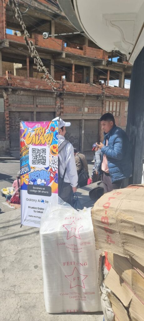 Samsung Bolivia promueve la aplicación Try Galaxy a través del Team AI. Este equipo de promotores está recorriendo los principales mercados de La Paz, Cochabamba y Santa Cruz para compartir con la población las principales funciones de Galaxy AI (inteligencia artificial) de la empresa.