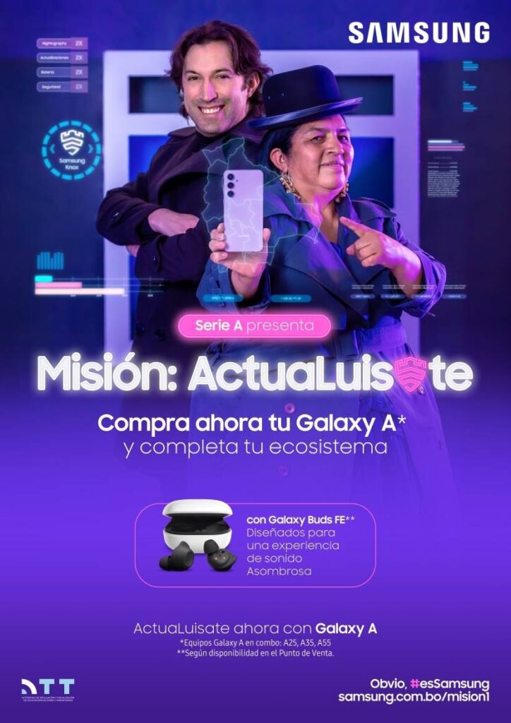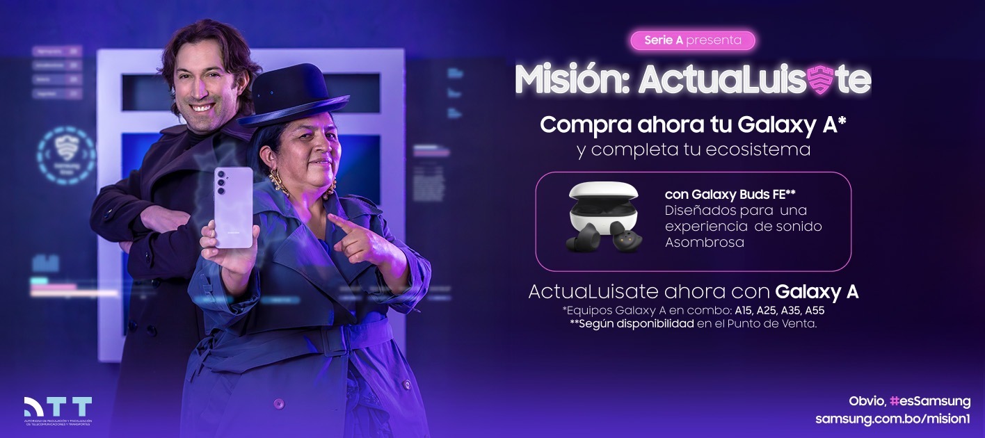 En el marco de la campaña ActuaLuisadores, protagonizada por Doña Luisa y Leonel Fransezze, Samsung lanza la “Misión ActuaLuisate” para fortalecer el ecosistema Galaxy en Bolivia. Esta iniciativa ofrece un combo exclusivo que incluye los dispositivos Galaxy A25, A35 y A55, junto con los audífonos Galaxy Buds FE.