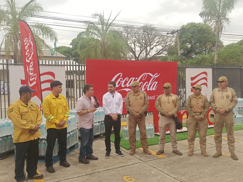 Cinco agrupaciones de bomberos voluntarios en Santa Cruz recibieron cerca de 3.600 litros de agua, que serán utilizados para la rehidratación del personal que combate el fuego.
