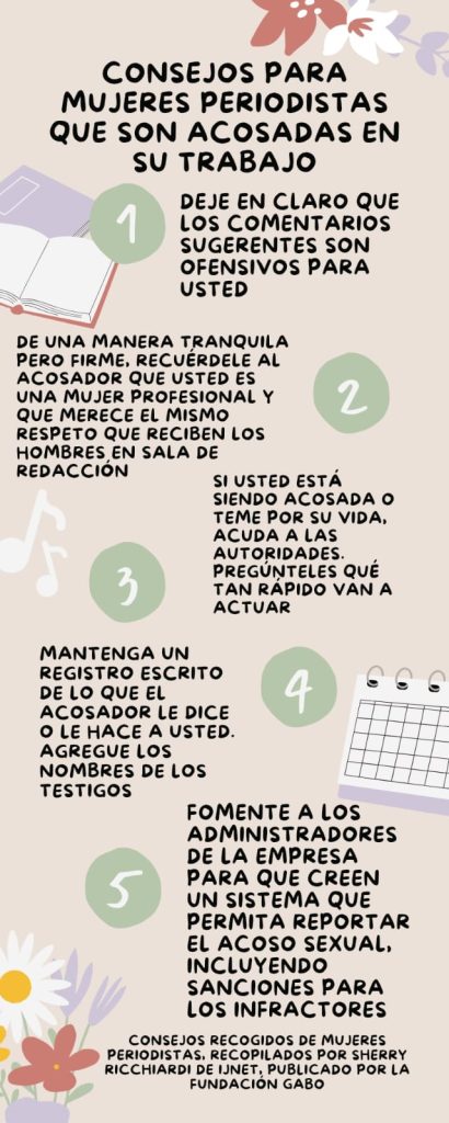 En 2015, la Fundación GABO publicó los consejos recogidos de mujeres periodistas, una recopilación realizada por la periodista Sherry Ricchuardi de International Journalist Network (IJNet), que indica lo siguiente:
